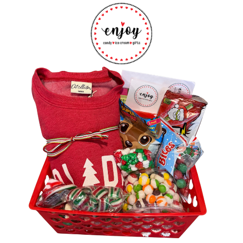 This festive “Enjoy” Holiday Basket includes a large holiday-themed sweatshirt, an assortment of freeze-dried candy, and a fun mix of seasonal treats such as Sour Punch Straws, Elf Biters, lollipops, suckers, sweets, and more. The basket also comes with a $10 gift certificate, making it a perfect holiday surprise for anyone who loves cozy apparel and has a sweet tooth.